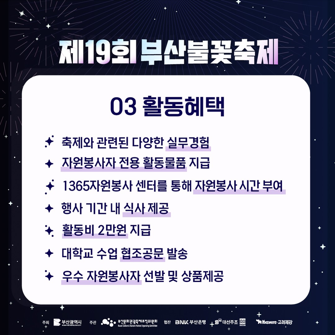 지원은 부산문화관광축제조직위원회 홈페이지를 통해 가능합니다. 불꽃축제의 자원봉사자로 함께 축제를 빛낼 기회를 놓치지 마세요!