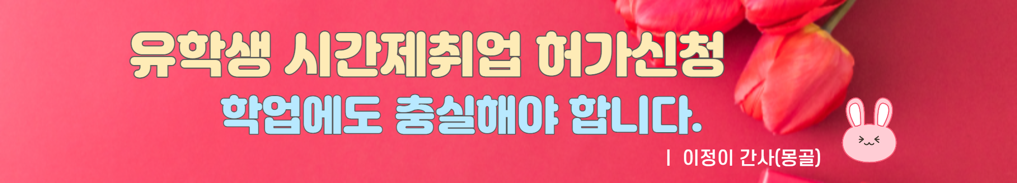 - 허용 직종: 통역 및 번역, 음식업 보조, 일반 사무보조 등 전공 및 능력에 맞는 분야에서 일할 수 있으며, 일부 제조업의 경우 한국어 능력 4급 이상을 소지한 경우 예외적으로 허용됩니다. Allowed Job Types: Students can work in fields such as translation and interpretation, food service assistance, general office support, etc., based on their major and skills. In some manufacturing jobs, exceptions may be made for students who have achieved at least a level 4 in the TOPIK (Test of Proficiency in Korean).