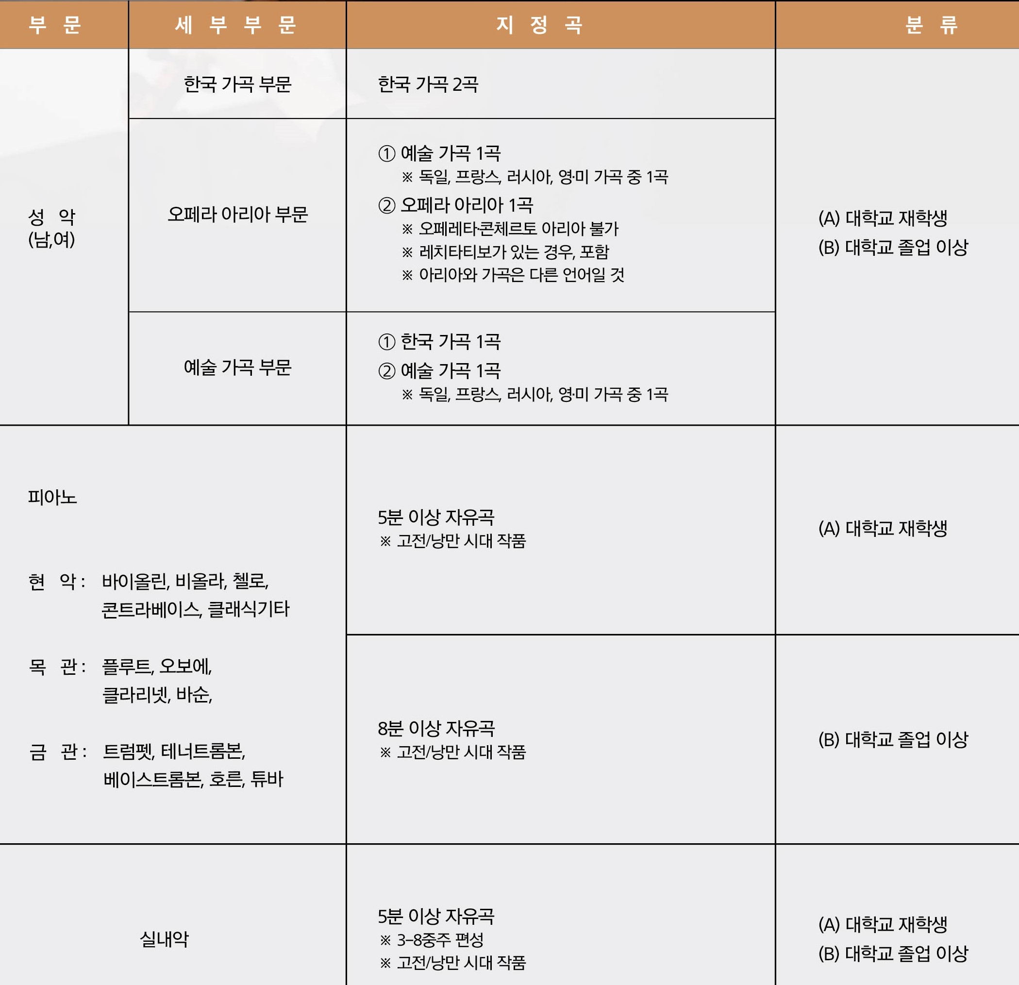 이번 대회는 성악, 피아노, 현악기, 목관, 금관, 실내악 등 다양한 부문으로 나뉘어 있습니다. 각 부문마다 연주해야 하는 지정곡이 있는데요, 성악 부문에서는 한국 가곡과 예술 가곡을 준비해야 하며, 피아노와 실내악 부문에서는 자유곡으로 경연할 수 있습니다.