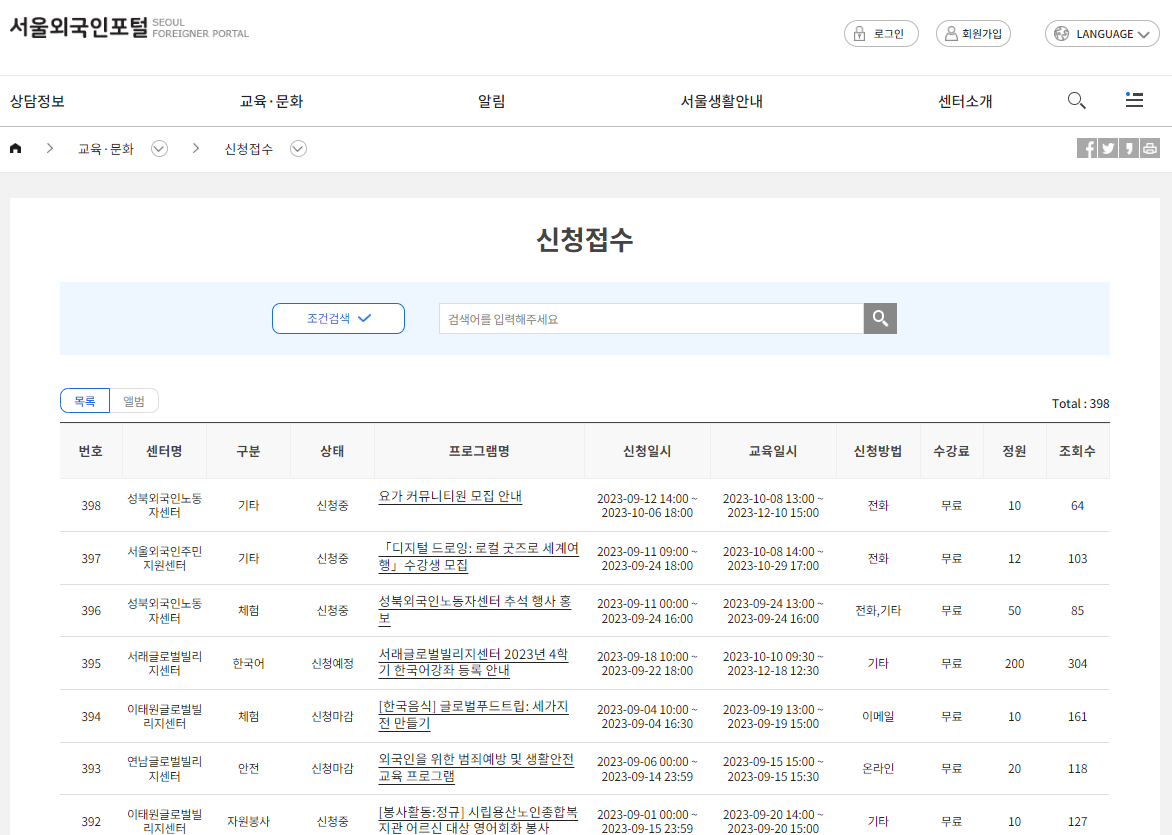 The Seoul Foreigners Portal provides information on various events and activities in Korea. It helps you not to miss the opportunity to enjoy various activities such as music festivals, exhibitions, and cultural festivals. You can also get information to participate in volunteer activities or contribute to the community.