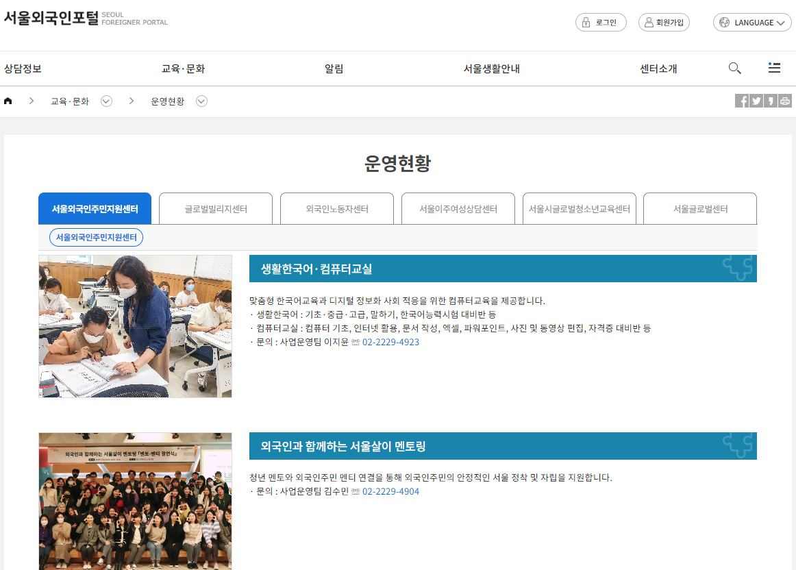 The Seoul Foreigners Portal provides information on various events and activities in Korea. It helps you not to miss the opportunity to enjoy various activities such as music festivals, exhibitions, and cultural festivals. You can also get information to participate in volunteer activities or contribute to the community.