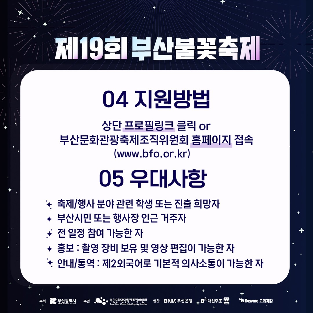 Priority will be given to students from festival and event-related departments or those aspiring to pursue a career in this field, Busan residents, or those living near the event venue, as well as individuals who can participate throughout the entire event. Candidates who own filming equipment or have video editing skills, as well as those who can communicate in a second foreign language, will also be preferred.