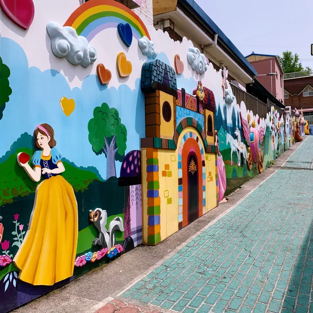 Songwol Donghwa Village is famous for its colorful murals. As you walk along the fairy tale mural street, you will find amazing artworks depicting classic fairy tales and cute characters. So the people who came here to see us take a commemorative photo!
