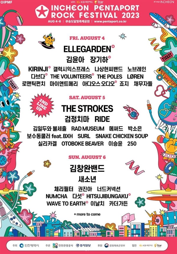 2023년 올해 인천 펜타포트 락 페스티벌은 2023년 8월 4일 금요일부터 8월 6일 일요일까지 송도달빛축제공원에서 개최됩니다. 더 스트록스, 장기하, 김창완밴드, 검정치마, 김윤아, 새 소년, 갤럭시 익스프레스 등 해외 유명 뮤지션과 한국의 유명 뮤지션들을 볼 수 있는 좋은 기회가 될 것입니다. 2023년 인천 펜타포트 록 페스티벌의 티켓은 3일권은 24만원, 2일권은 18만원, 1일권은 12만원 정도입니다. 이때 국민카드가 있는 경우 할인된 가격으로 구매할 수 있으니 확인하고 구매하시면 좋을 것 같습니다.
