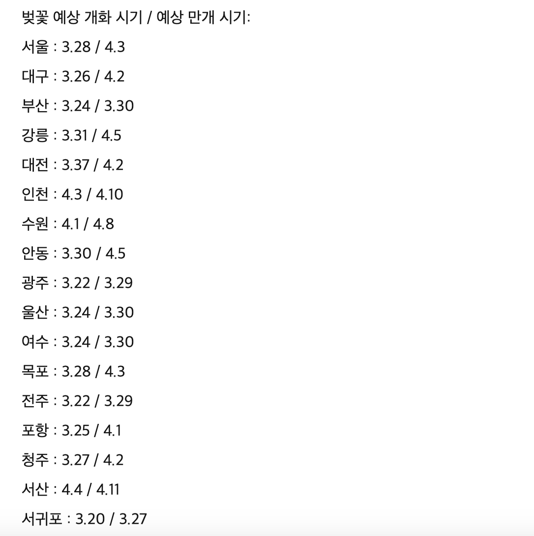 지역에 따른 2023년 벚꽃 개화/만개 시기는 다음과 같아요